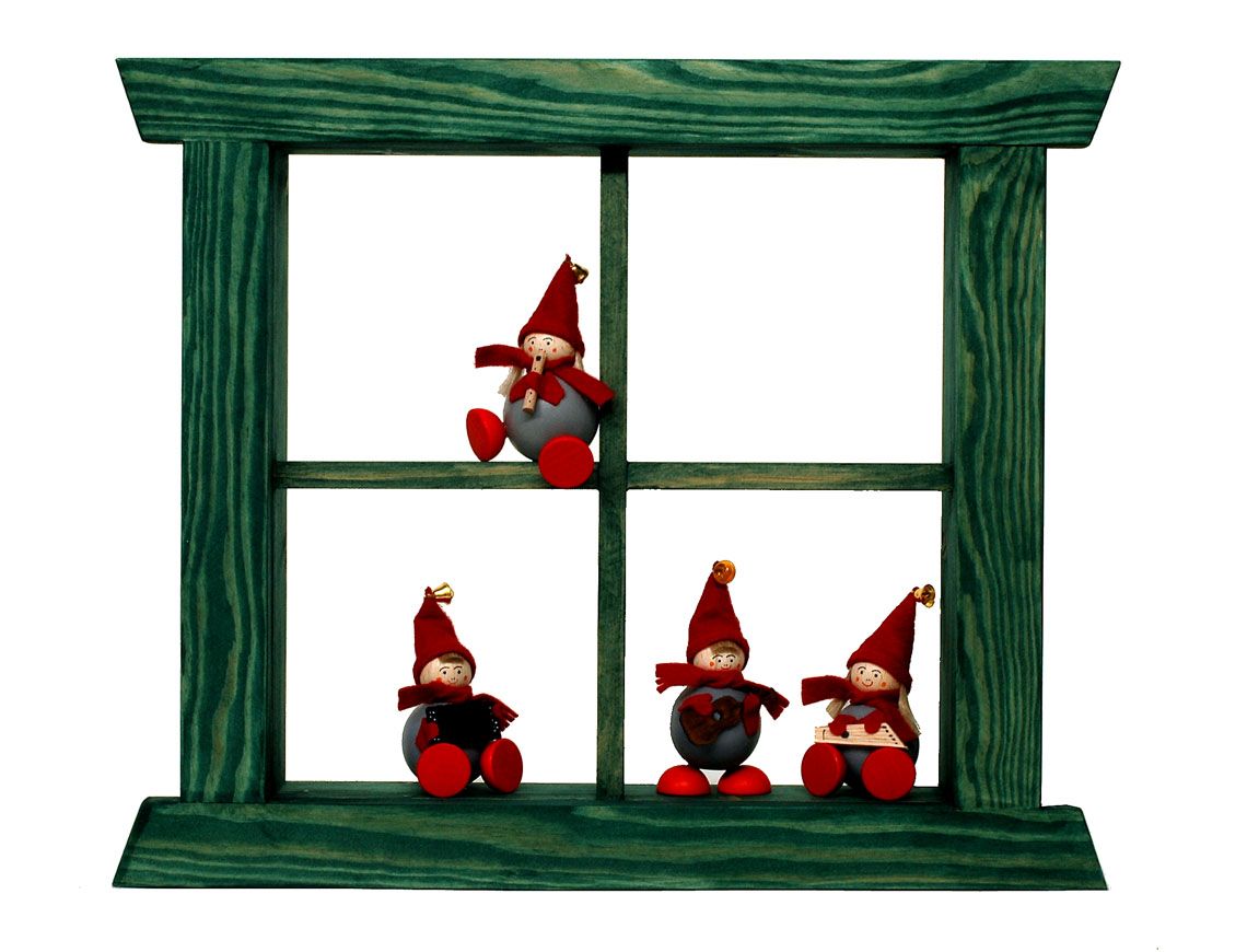 Rustikal windowframe, pinewood in green with 4 Tonttu with kantele, guitar, accordion, flute