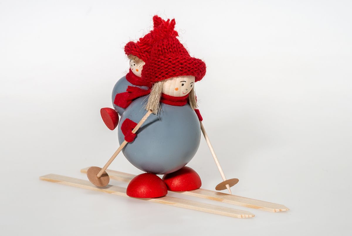Tonttu äiti ja poika reppuselässä suksilla